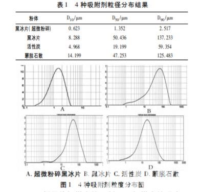 蒙藥黑冰片( har gabur) 為豬科動物野豬 Sus scrofa L. 的干燥糞便,經密封煅成炭用,有消食、平 息“希日”、殺“粘”、破痞之功效,用于寒“希日”病, 消化不良,黃疸,“希日”痞,“希日”疫、“粘”疫,胃 “希日”癥,“粘”痧等病癥。活性炭具有較好的 吸附作用,黑冰片與活性炭外表很相似,但是黑冰片 在作為炭狀物的吸附性能方面卻很少有相關研究, 因此本文對黑冰片吸附性能開展了一系列研究,比 較了不同批次,不同粒徑黑冰片的吸附性能,并與活性炭、蒙脫石進行比較,為探索其治療作用機理以及 新制劑、新功效的開發提供實驗數據支持。