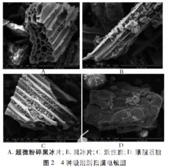 經掃描電鏡觀察黑 冰片的結構與活性炭相似,呈規則的網孔狀,蒙脫石 散呈不規則的塊狀結構,見圖 2。