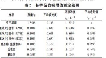 各樣品吸附值結果見表 2。 結果顯示,黑冰片對亞甲基藍有一定的吸附作用,不 同生產批次的同等質量的黑冰片吸附能力差異不 大,說明生產廠家生產的黑冰片質量穩定。比較不 同粒徑黑冰片吸附能力可知,黑冰片顆粒粒徑越小, 吸附能力越強。比較相同質量的各種吸附劑的吸附 能力,黑冰片的吸附能力最弱,蒙脫石吸附能力最 強。由此可以得出黑冰片作為炭類藥物具有一定吸 附能力,但是其吸附能力與活性炭、蒙脫石這類臨床 常見藥相比不是很強。