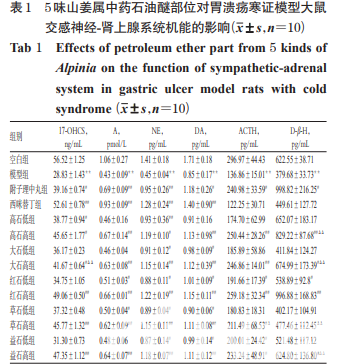 知母、高良姜、大高良姜、紅豆蔻、草豆蔻、益智飲片 (批號分別為 150601、160101、170912、160605、170801、 170718)均購自南寧生源中藥飲片有限責(zé)任公司,經(jīng)廣 西中醫(yī)藥大學(xué)中藥鑒定學(xué)教研室田慧教授鑒定為真品。 附子理中丸(陽性對照,北京同仁堂科技發(fā)展股份 有限公司制藥廠,批號:15010241,規(guī)格:每 100 粒重 10 g);西咪替丁片(陽性對照,廣東華南藥業(yè)集團(tuán)有限公 司 ,批 號 :150802,規(guī) 格 :0.2 g);17- 羥 皮 質(zhì) 類 固 醇 (17-OHCS)、腎上腺素(A)、去甲腎上腺素(NE)、多巴胺 (DA)、促腎上腺皮質(zhì)素(ACTH)、多巴胺-β-羥化酶 (D-β-H)試劑盒(上海酶聯(lián)生物科技有限公司,批號分別 為 RA20057、RA20337、RA20557、RA20050、RA20014、 RA20218);乙醇、乙酸乙酯等試劑均為分析純,水為蒸 餾水。
