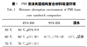 4) 在溫度小于 60 ℃,非浸水環(huán)境中,PMI 泡 沫夾層結(jié)構(gòu)復(fù)合材料的飽和吸濕率可以通過相同 條件下面板和 PMI 泡沫的吸濕率進(jìn)行預(yù)測(cè)。