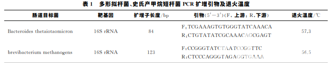 將多形擬桿菌、史氏 產甲烷 短 桿 菌 的 PCR 產 物 經 切 膠、回 收 后 作 為 DNA 標準品,將 標 準 品 稀 釋 為 濃 度 梯 度 為 101 ~ 108 copies/μL的 DNA 樣本作為陽性模板,同 時 以 Nuclease-Free-water為陰性 對 照,每 個 樣 平 行 重 復 3次,反應體系(20μL):上、下游引物各0.5μL,熒 光染料(SYBRGreenI)10μL,DNA 模板2μL,Nu- clease-Free-water7μL,反 應 程 序:預 變 性 95℃、 2min,變性95℃、5s,退火(表1)、30s,35個循環。 由實時熒光定量 PCR儀自動繪制擴增曲線、熔鏈曲 線,產 物 通 過 熔 鏈 曲 線 證 實。反 應 結 束 后 用 PCR 儀附帶軟件分析,自動生成標準曲線。