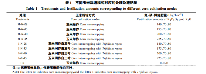 選擇耐密、緊湊型‘先玉 335’為玉米供試品種,采取等壟寬常規(guī)栽培,于 2018 年 4 月 28 日播種,壟寬64 cm,株距 23.9 cm,種植密度為 6.5 萬株·hm-2 ,玉米栽植過程不使用任何除草劑。供試白三葉品種為 ‘海法’,品種來源于以色列,三葉草屬,多年生草本。于 5 月 18 日玉米大喇叭口期進行間作播種,采取條 播方式進行,在距離玉米根部 20 cm 兩側(cè)直播白三葉種子,播深 1.5 cm,播種量為 6 g·m-2 。 試驗共設(shè) 9 個處理( 表 1) ,包括玉米單作系列的 4 個處理、玉米間作白三葉系列的 4 個處理以及玉米 單作不施肥對照,每個處理重復 3 次,共計 27 個小區(qū),每個小區(qū)長 11 m、寬 9.66 m,小區(qū)面積為 106.26 m2 , 區(qū)組間設(shè)有 1 m 保護行。供試化肥分別為尿素、磷酸二銨和氯化鉀。具體施肥方案: 氮肥的 1 /2、鉀肥的 1 /2 以及全部的磷肥用于基肥,其余 1 /2 的氮肥以及 1 /2 的鉀肥用作追肥,在玉米拔節(jié)期施用。在白三葉 出苗后,按玉米拔節(jié)期、抽雄期和灌漿期采用五點法動態(tài)采集各小區(qū) 0 ~ 20 cm 耕層土樣,風干,去除可見 植株殘體,粉碎,過 0.25 mm 篩后,置于磨砂廣口瓶中保存。