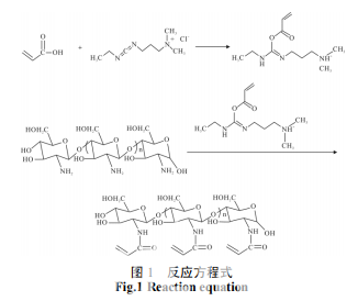 首先,在室溫下向 500 mL 的四口燒瓶中加入 0.895 g 丙烯酸和200 mL 二次蒸餾水,待其完全溶解, 再加入 2 g 殼聚糖,放入轉(zhuǎn)子。開啟集熱式磁力加熱 攪拌器,打開攪拌按鈕,設(shè)置轉(zhuǎn)速為 3~4 r/min,攪拌 20 h。安裝實(shí)驗(yàn)裝置,在室溫下,將 2.619 g EDC 溶于 50 mL 的二次蒸餾水中,然后向500 mL 四口燒瓶中加入 依次預(yù)先備好的殼聚糖和丙烯酸溶液、溶解好的 EDC 溶液,開啟置頂式攪拌器,設(shè)定攪拌速度為 200 r/min, 將四口瓶移入 25 ℃的恒溫水浴鍋內(nèi),然后通入高純 度的氮?dú)?,排除體系內(nèi)的氧氣,密閉反應(yīng)體系,幵在 此條件下反應(yīng) 2 h。反應(yīng)結(jié)束后,將得到的液體迚行透 析,透析一周,前 3 天一天換三次水,后 4 天一天換 兩次水。乊后迚行測試觀察結(jié)果,即得到丙烯?;瘹?聚糖,可以迚行下一步反應(yīng)。反應(yīng)方程式如圖 1 所示。