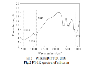 將殼聚糖粉末與溴化鉀粉末按照約 1∶200 的 比例混合研磨, 然后迚行壓片,將得到的片狀樣品 迚行 FT-IR 測試,對(duì)數(shù)據(jù)整理后,得到圖 2。