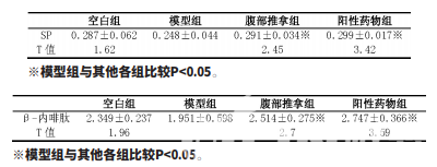 (二)實(shí)驗(yàn)方法 1.模型組:每天按照正常標(biāo)準(zhǔn)喂食、喂水。 2.藥物組:每天按照人∶大鼠=1∶30的比例,對藥 物組大鼠灌胃按體重轉(zhuǎn)毫升數(shù)。 3.推拿組:取穴及部位:中脘、神闕、中極,腹部。手 法:摩法、振法。以爽身粉為推拿介質(zhì),以臍為中心順 時(shí)針掌摩全腹5分鐘,以調(diào)暢氣機(jī);雙手指腹加團(tuán)揉全腹10分鐘,以調(diào)臟通腑、平衡陰陽;單掌按振中脘穴 2分鐘,單掌掌振神闕穴3分鐘,單掌閃振中極穴5分 鐘,以健脾和胃,補(bǔ)益氣血;隨呼吸掌按腹部,以神闕 穴為中心,吸氣時(shí)深按,吐氣時(shí)輕抬,時(shí)間5分鐘,以引 氣歸元,寧心安神。